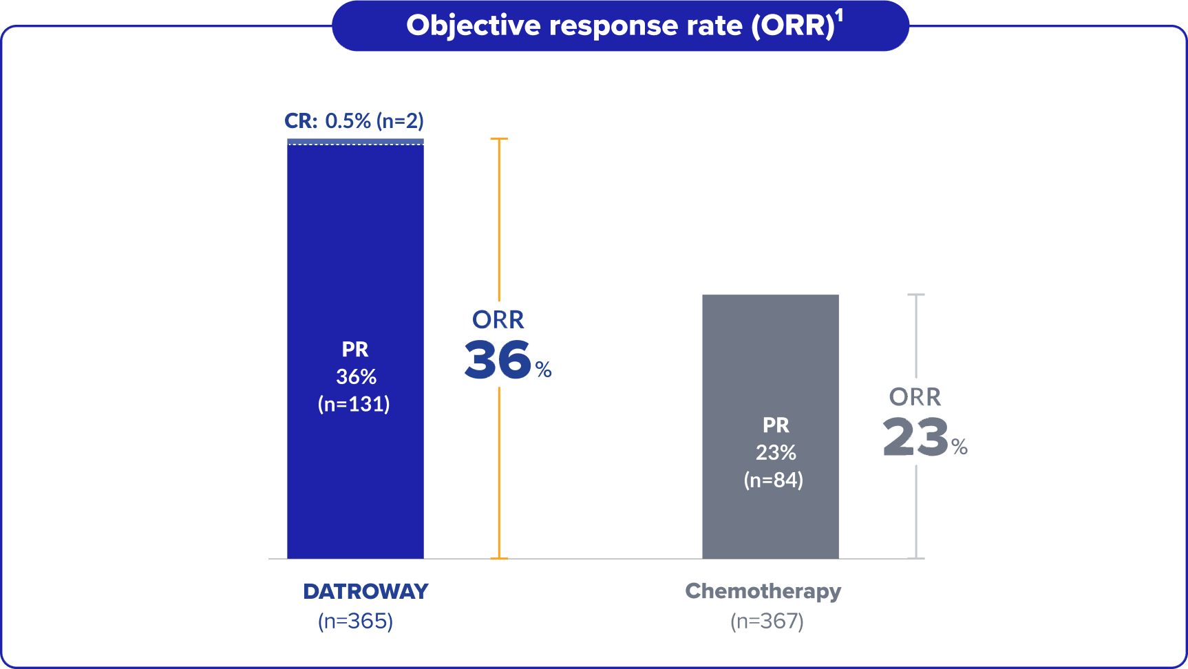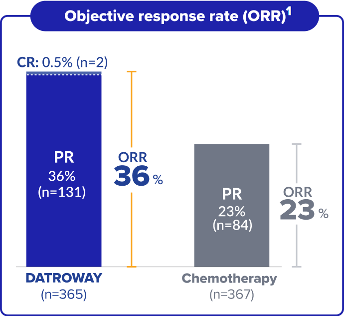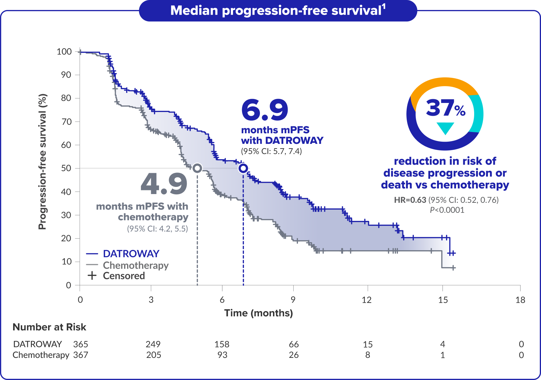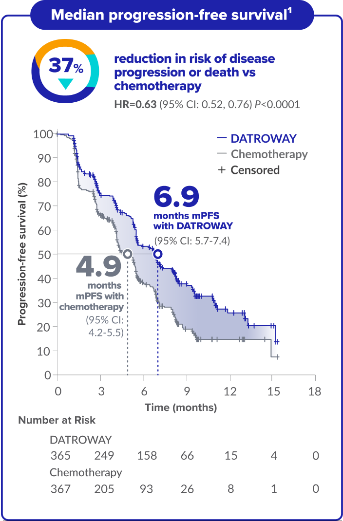 DATROWAY® is a Trop-2-directed antibody and topoisomerase inhibitor conjugate indicated for the treatment of adult patients with unresectable or metastatic, hormone receptor (HR)-positive, human epidermal growth factor receptor 2 (HER2)-negative (IHC 0, IHC 1+ or IHC 2+/ISH−) breast cancer who have received prior endocrine-based therapy and chemotherapy for unresectable or metastatic disease.